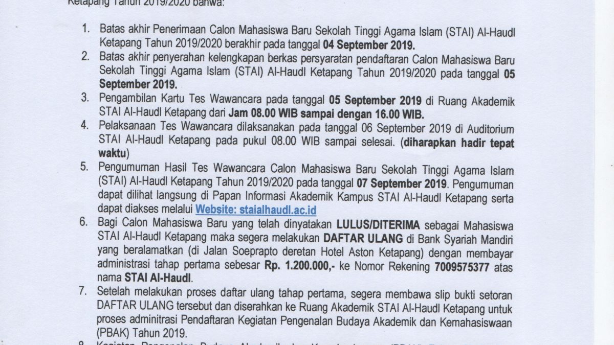 Diberitahuan kepada seluruh Calon Mahasiswa Baru Sekolah Tinggi Agama Islam (STAI) Al-Haudl Ketapang Tahun 2019/2020 bahwa: